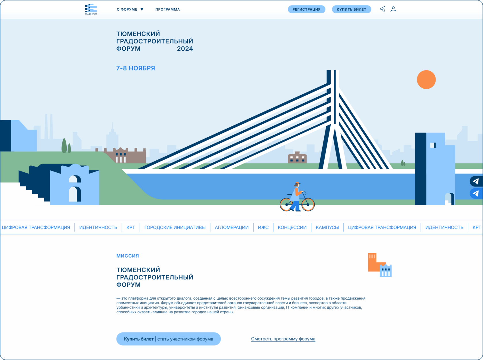 Тюменский градостроительный форум – это платформа для открытого диалога, созданная с целью всестороннего обсуждения темы развития городов, а также продвижения совместных инициатив. Форум объединяет представителей органов государственной власти и бизнеса, экспертов в области урбанистики и архитектуры, университеты и институты развития, финансовые организации, IT компании и многих других участников, способных оказать влияние на развитие городов нашей страны.
