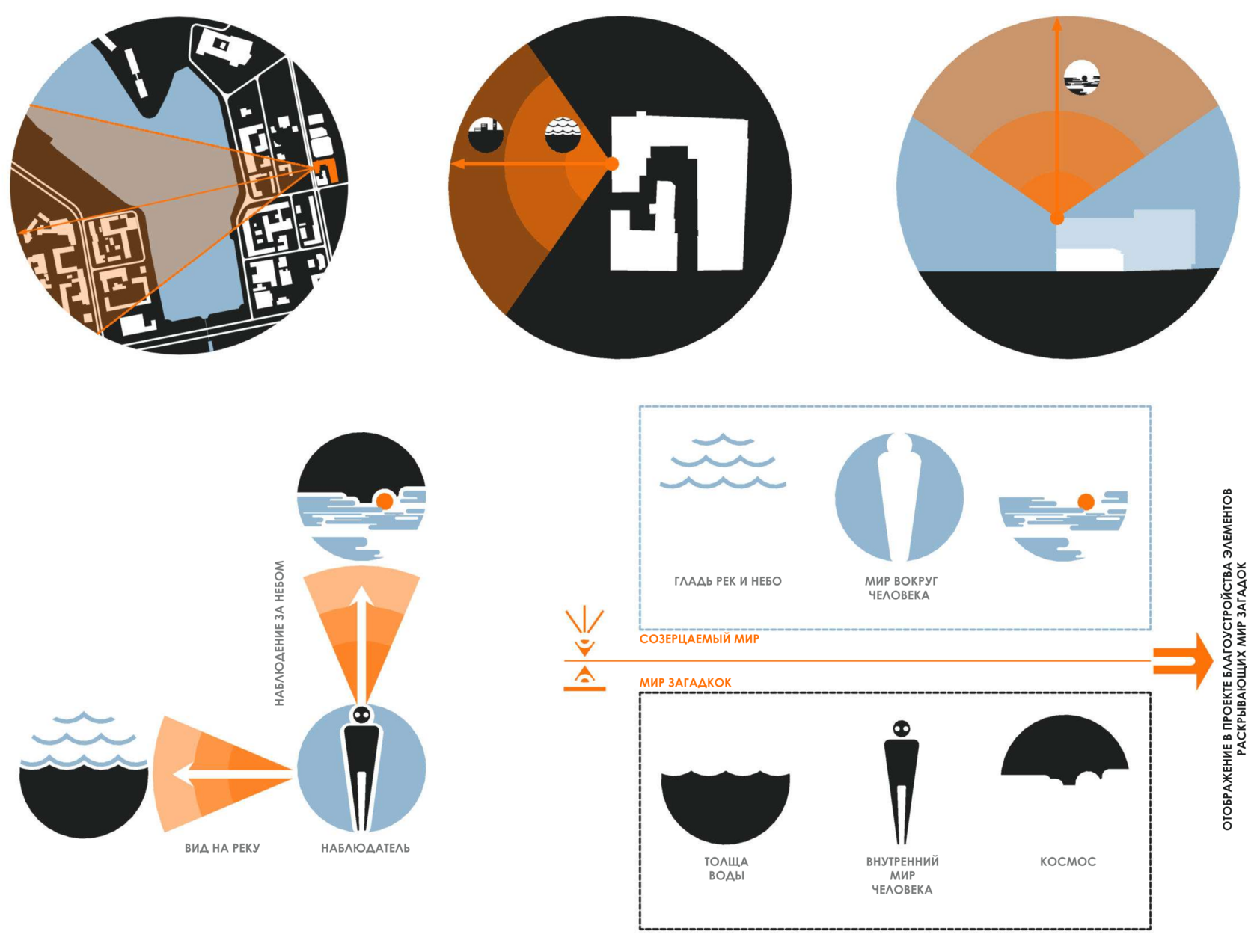 Была выработана концепция, позволяющая вписать объект в среду с возможностью обзорной панормы на город и реку, а так же функцию наблюдения за небом.