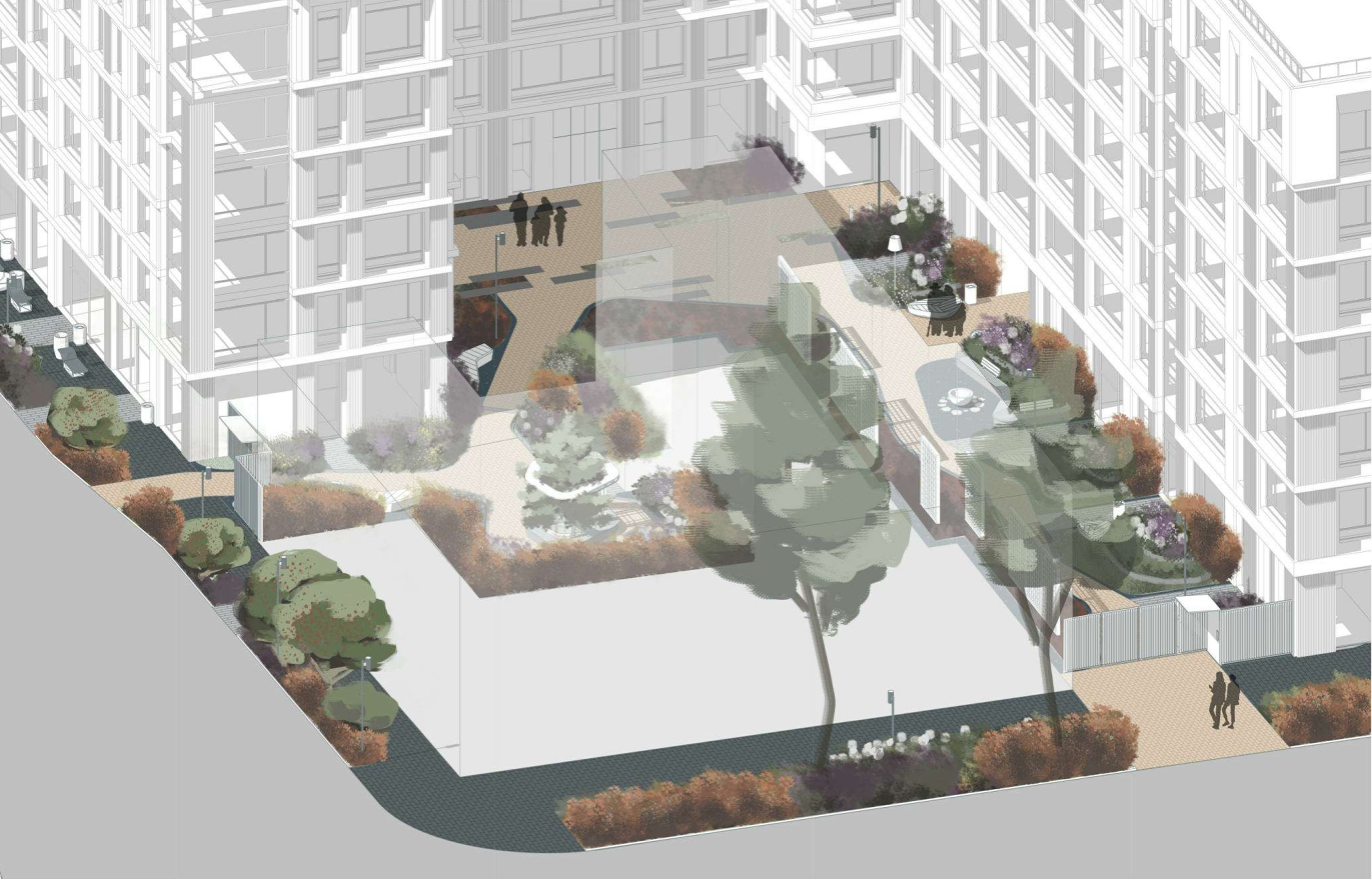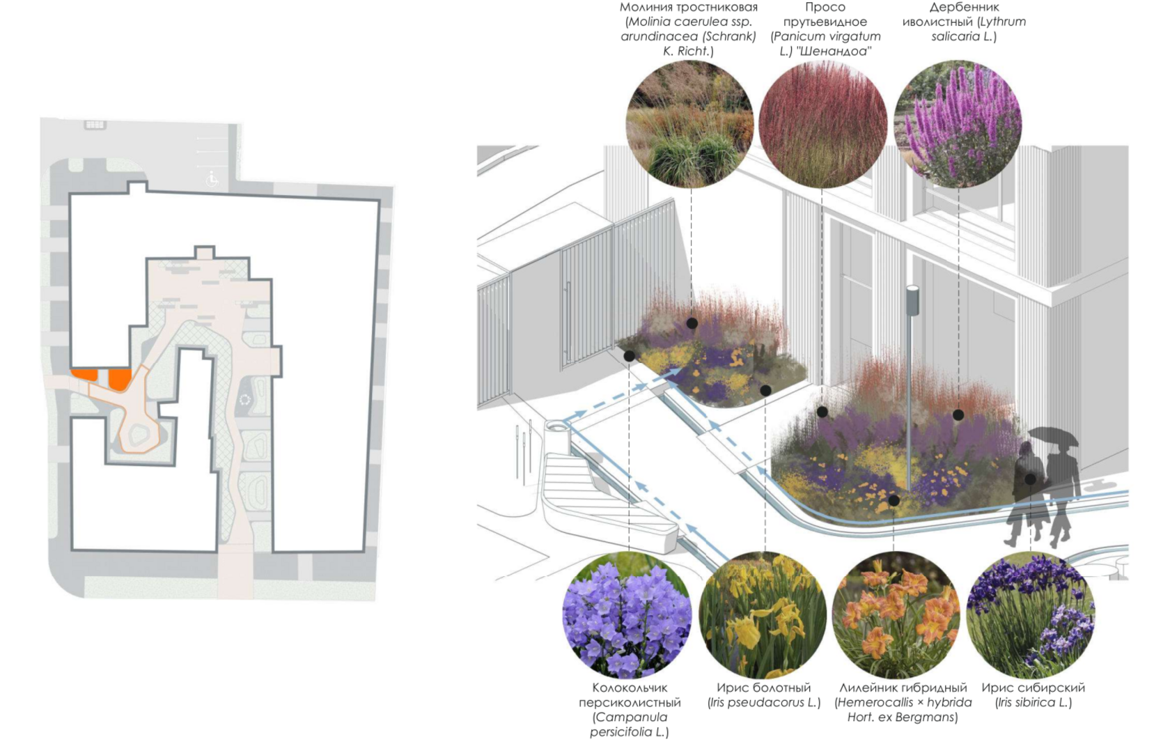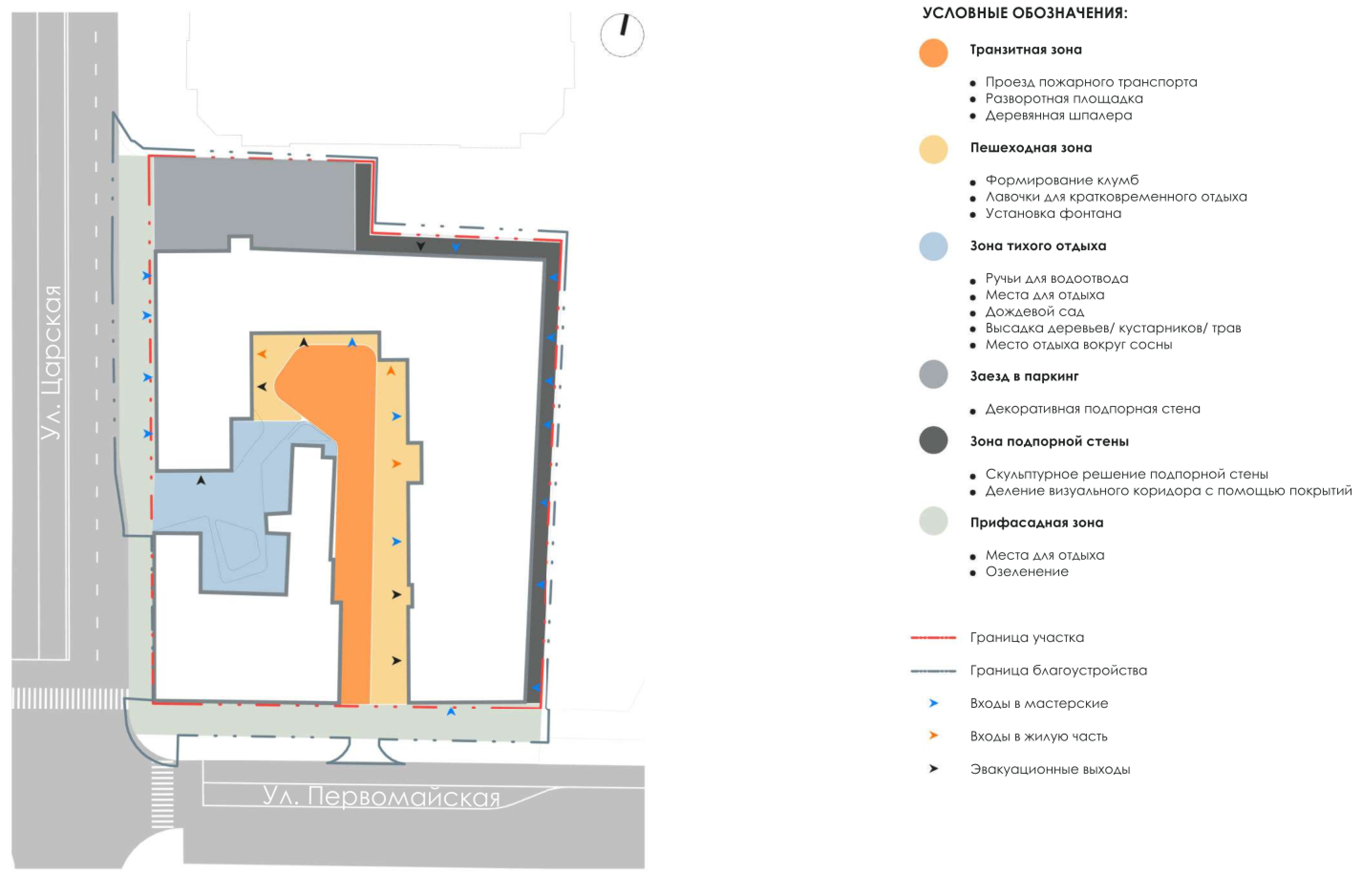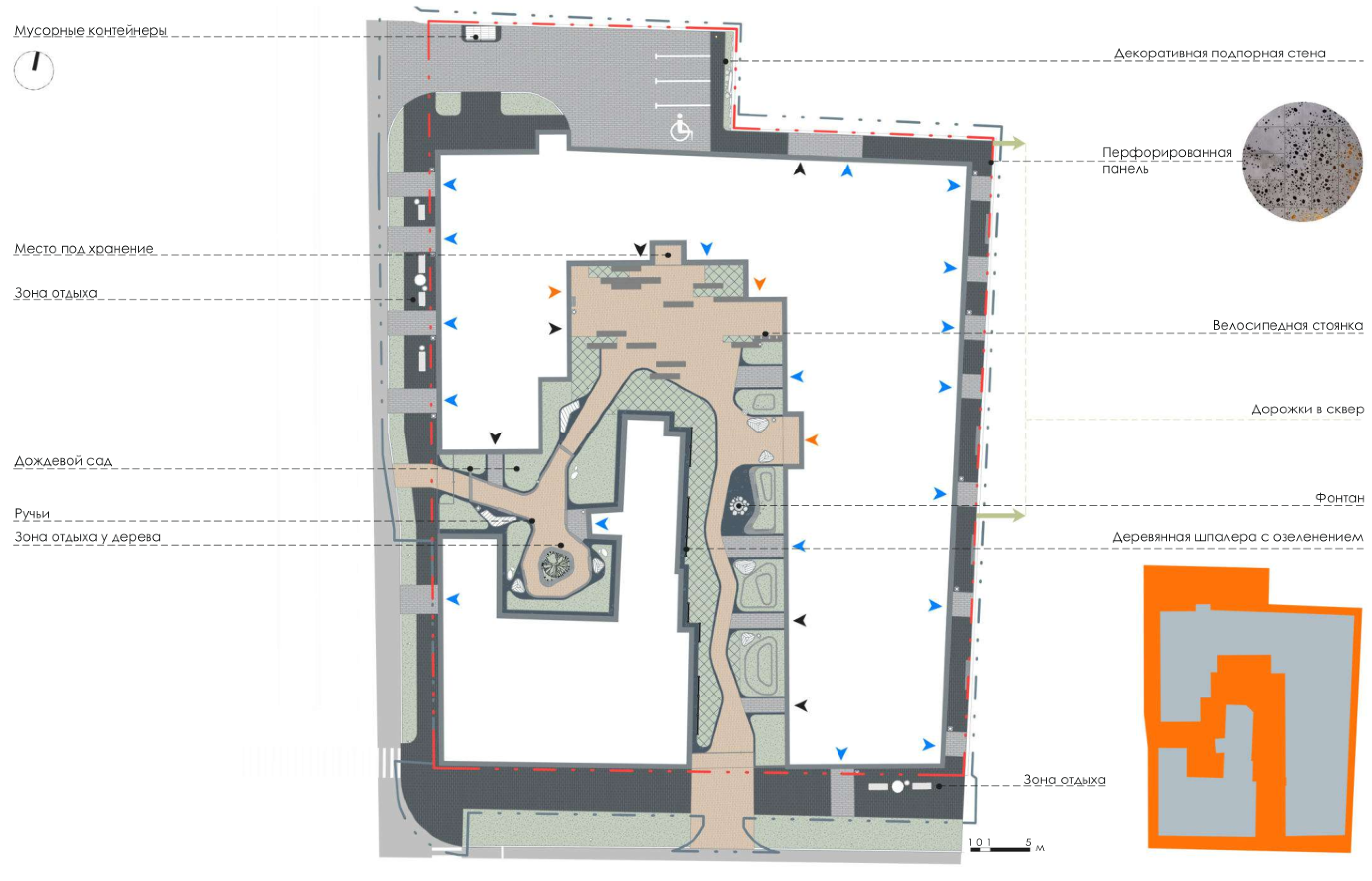 Функциональное зонирование предлагает следующие варианты использования территории: транзитную зона, пешеходную зону, зону тихого отдыха, заезд в паркинг, зону подпорной стены, прифасадную зону. Разработано планировочное решение для внутреннего двора.