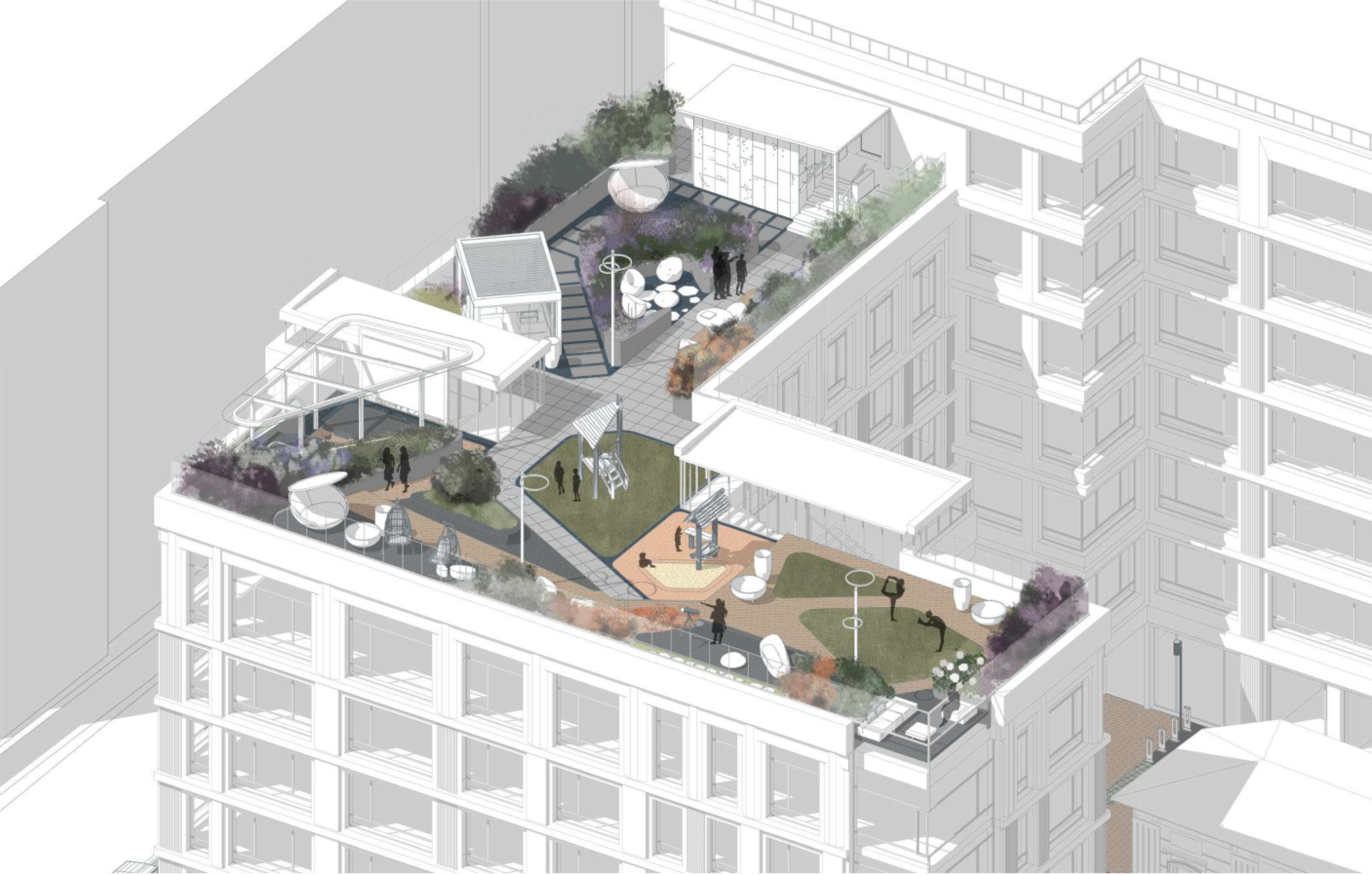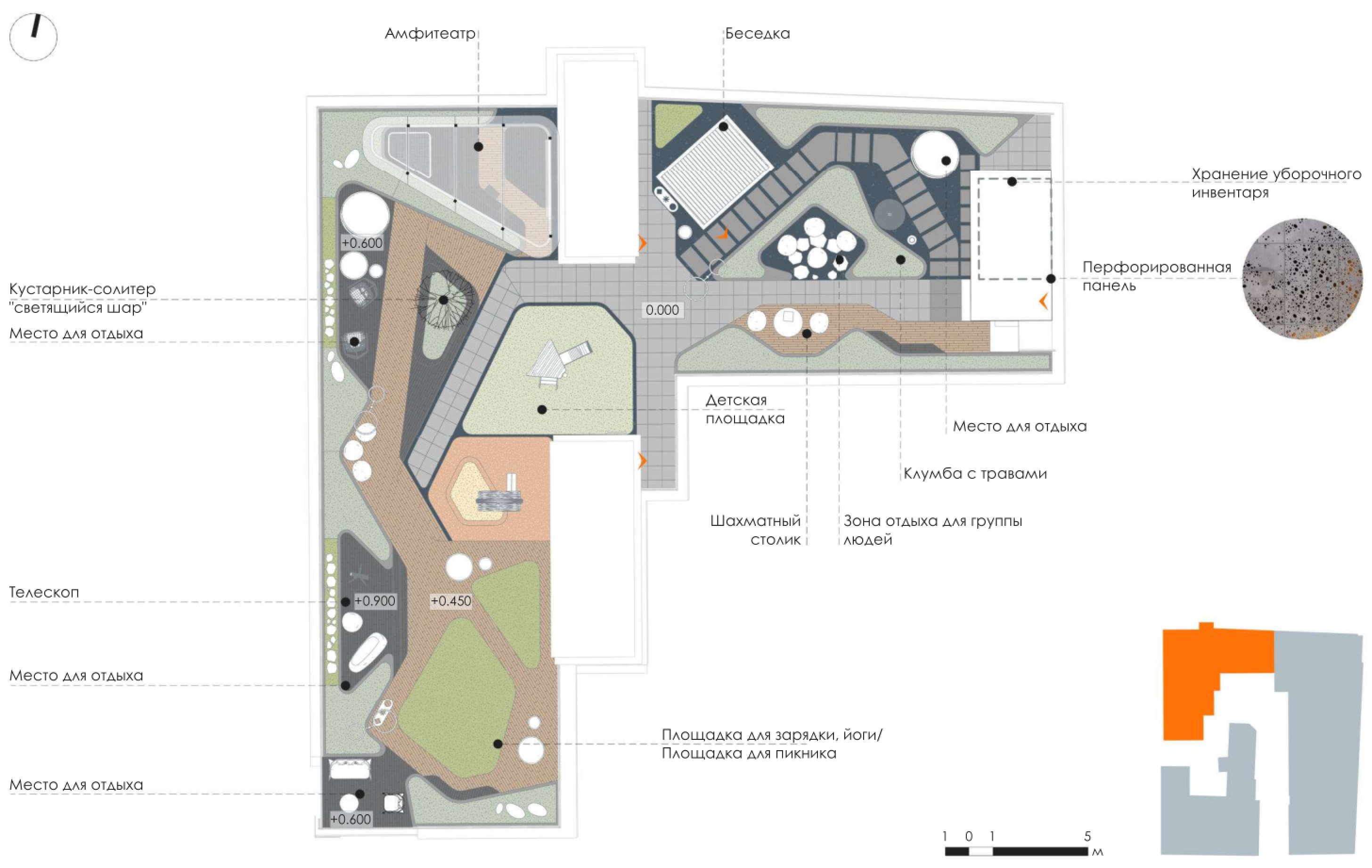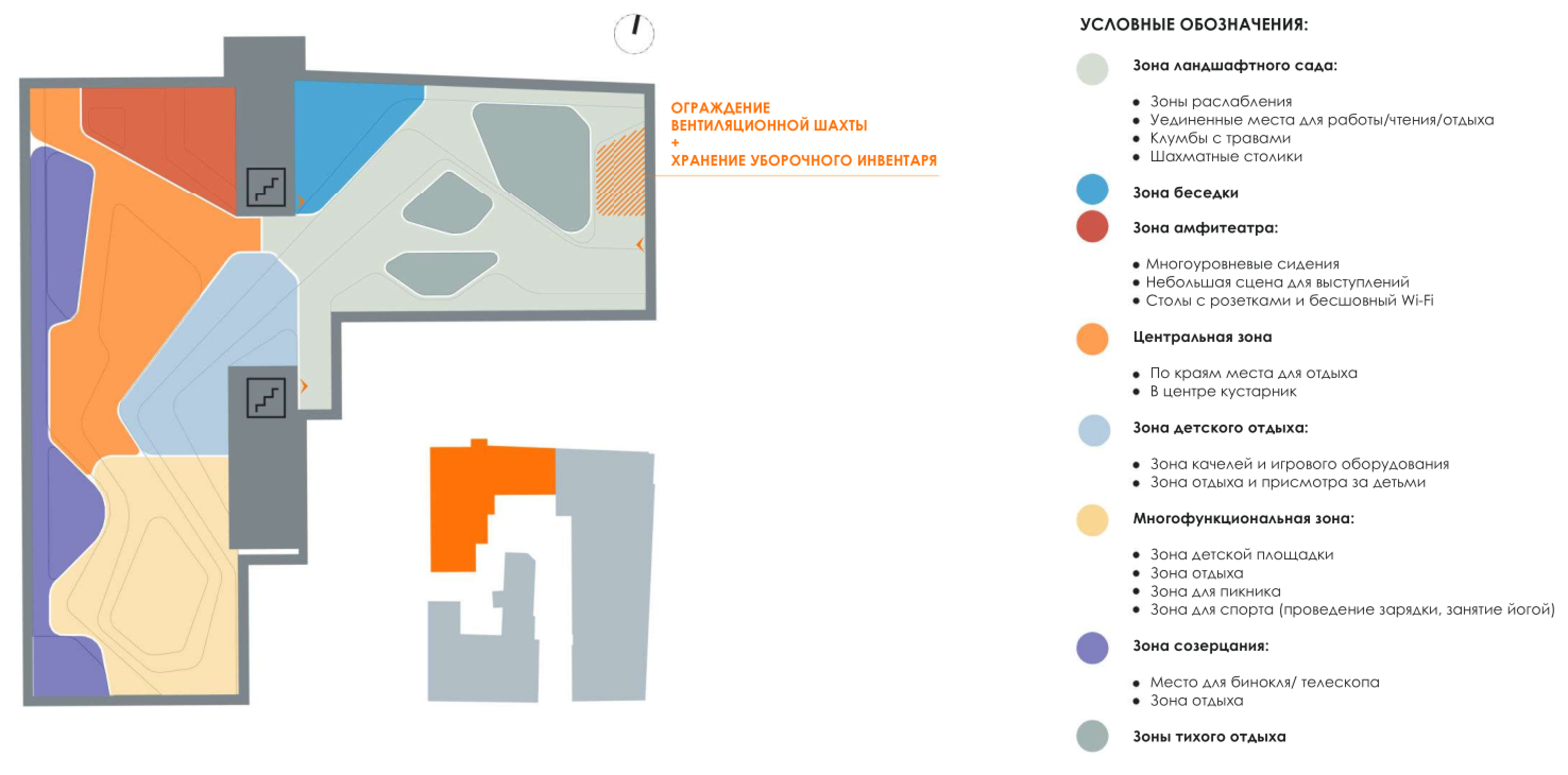 Функциональное зонирование кровли делится на: зону ландшафтного сада, зону беседки, зону амфитеатра, центральную зону, зону детского отдыха, многофункциональную зону, зону созерцания и зону тихого отдыха. Так же разработано планировочное решение.