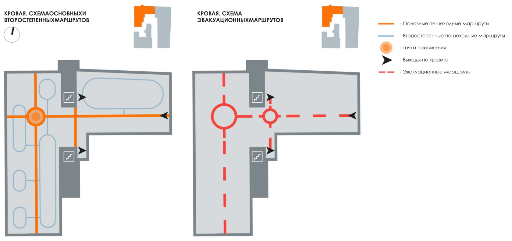 Схема пешеходных маршрутов на кровле основывается на создании точек притяжения, возникающих на пересечениях пешеходных маршрутов, связывающих функциональные зоны.