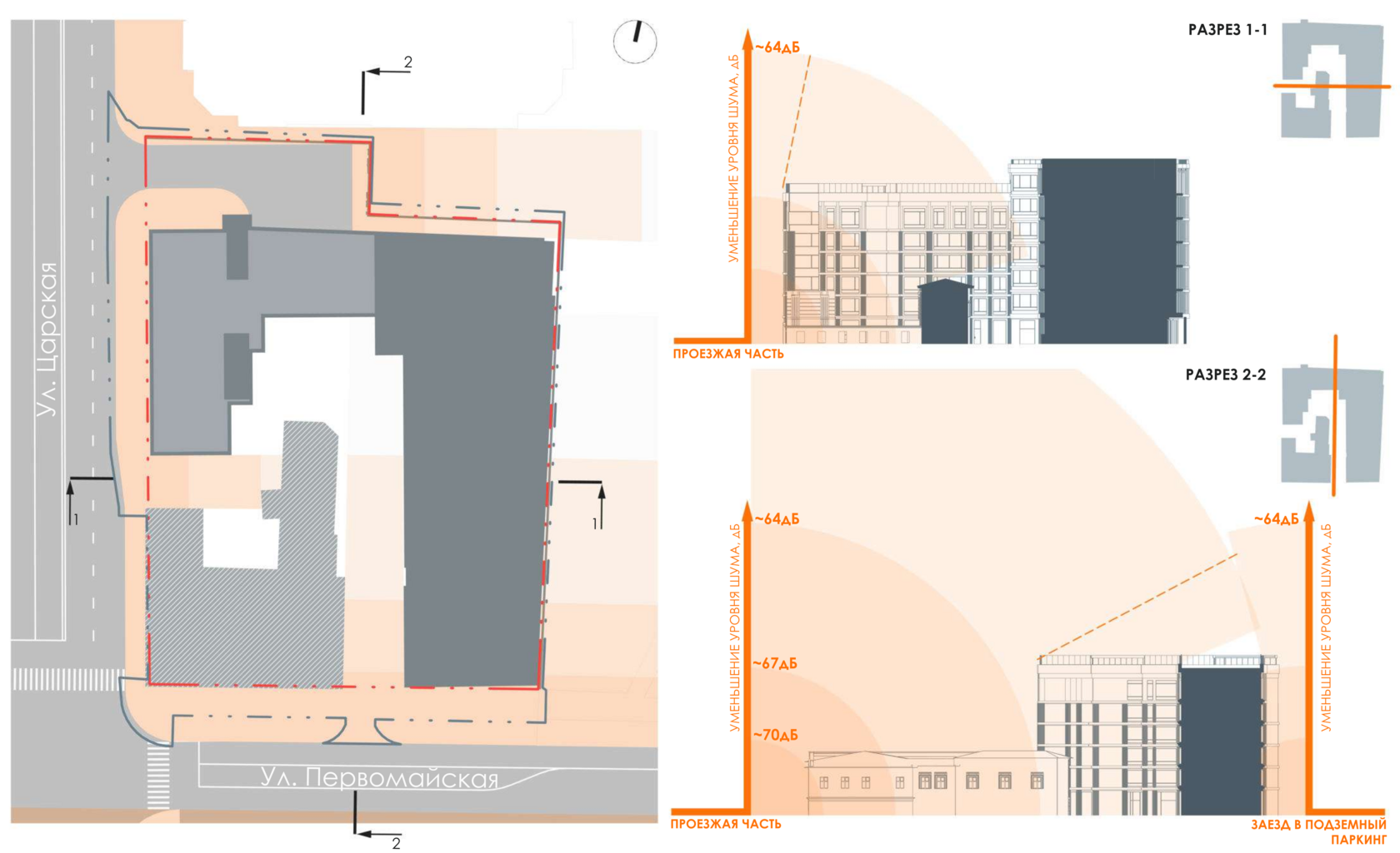 Схема степени шумового загрязнения выявила необходимость размещения по контуру шумоподвляющего ландшафта, а так же размещение тихих зон дальше от проезей части.