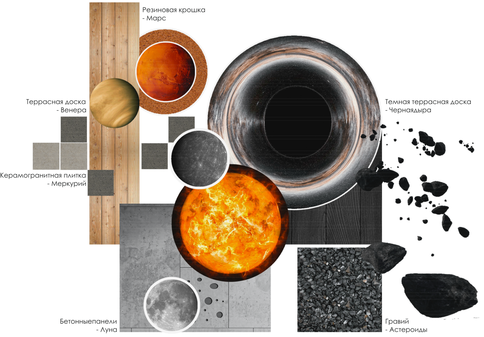 Цветовая палитра и текстура материалов была подобрана исходя из заложенной концепции приближения к космическому пространству, покрытия отсылают к идее структуры и материалам разных планет.