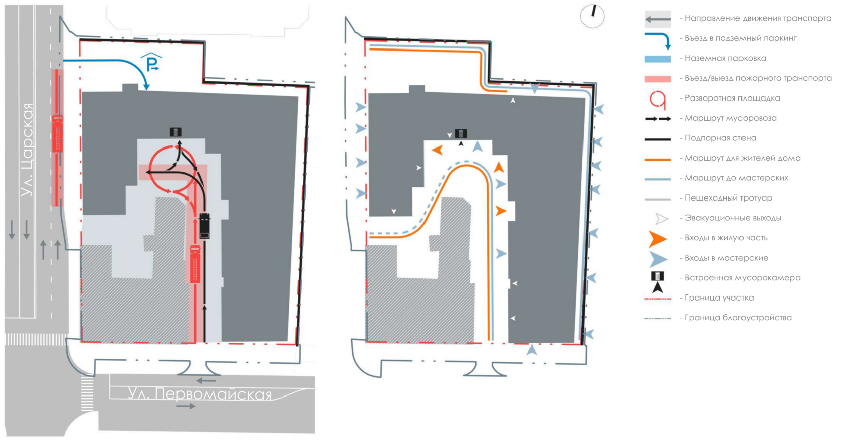 Разработана схема пешеходных и транспортных потоков, предлагающая решения имеющихся проблем с транспортным потоком и зоной ТБО.