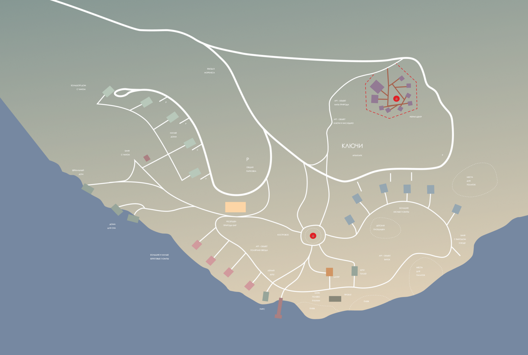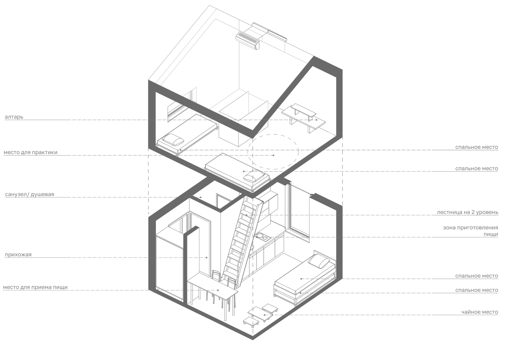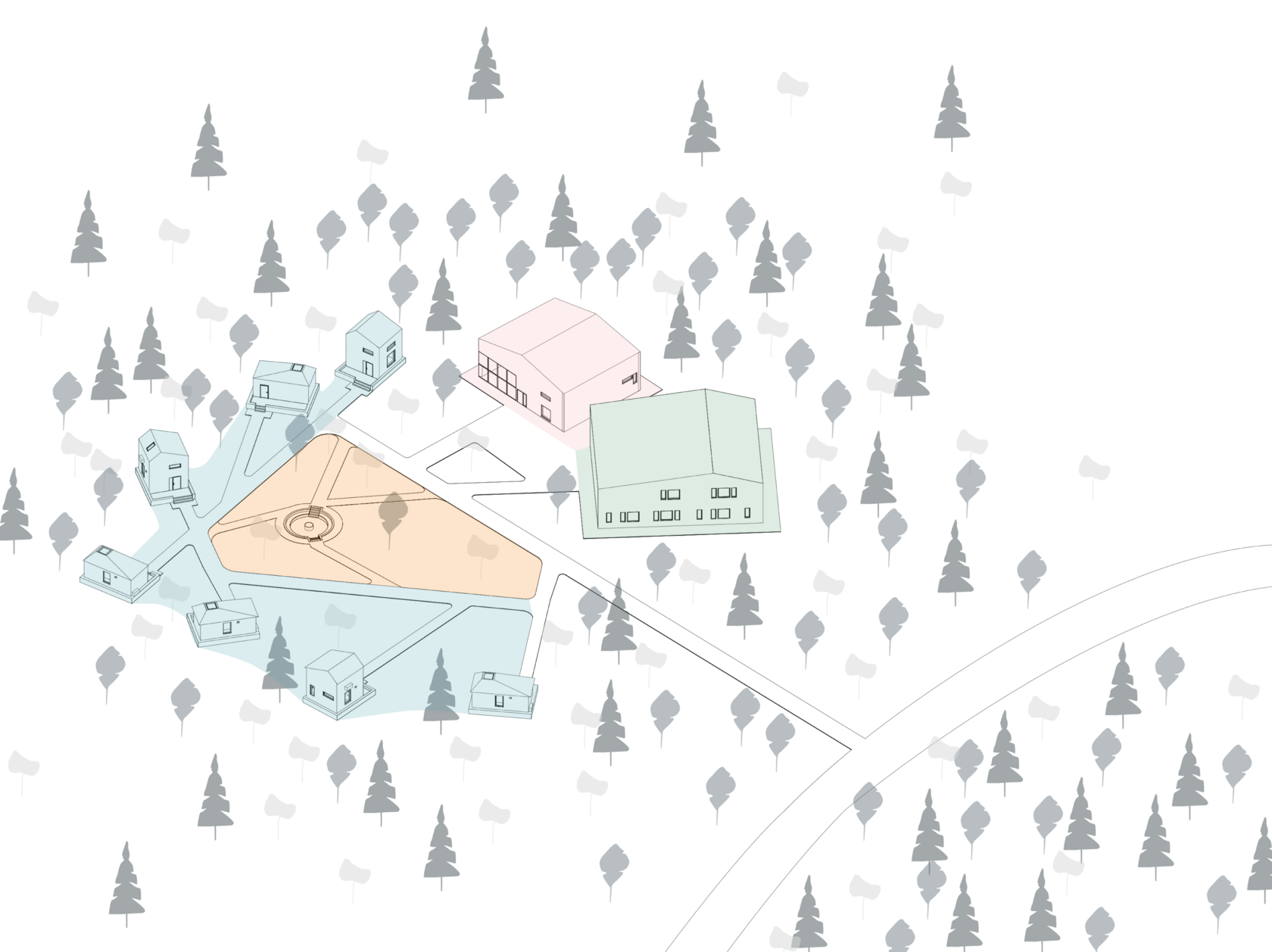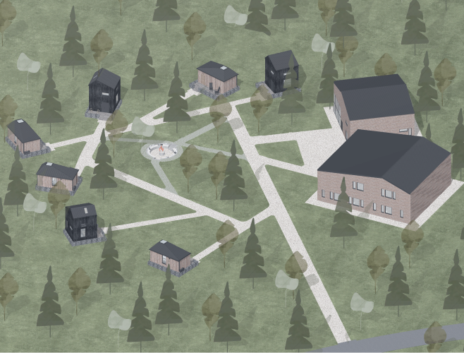 Пространство формирует группа индивидуальных жилых домов, ретрит-центр, банно-оздоровительный комплекс и костровое место. Индивидуальные жилые дома предназначены для временного пребывания и предполагают вероятность уединения для индивидуальных практик.