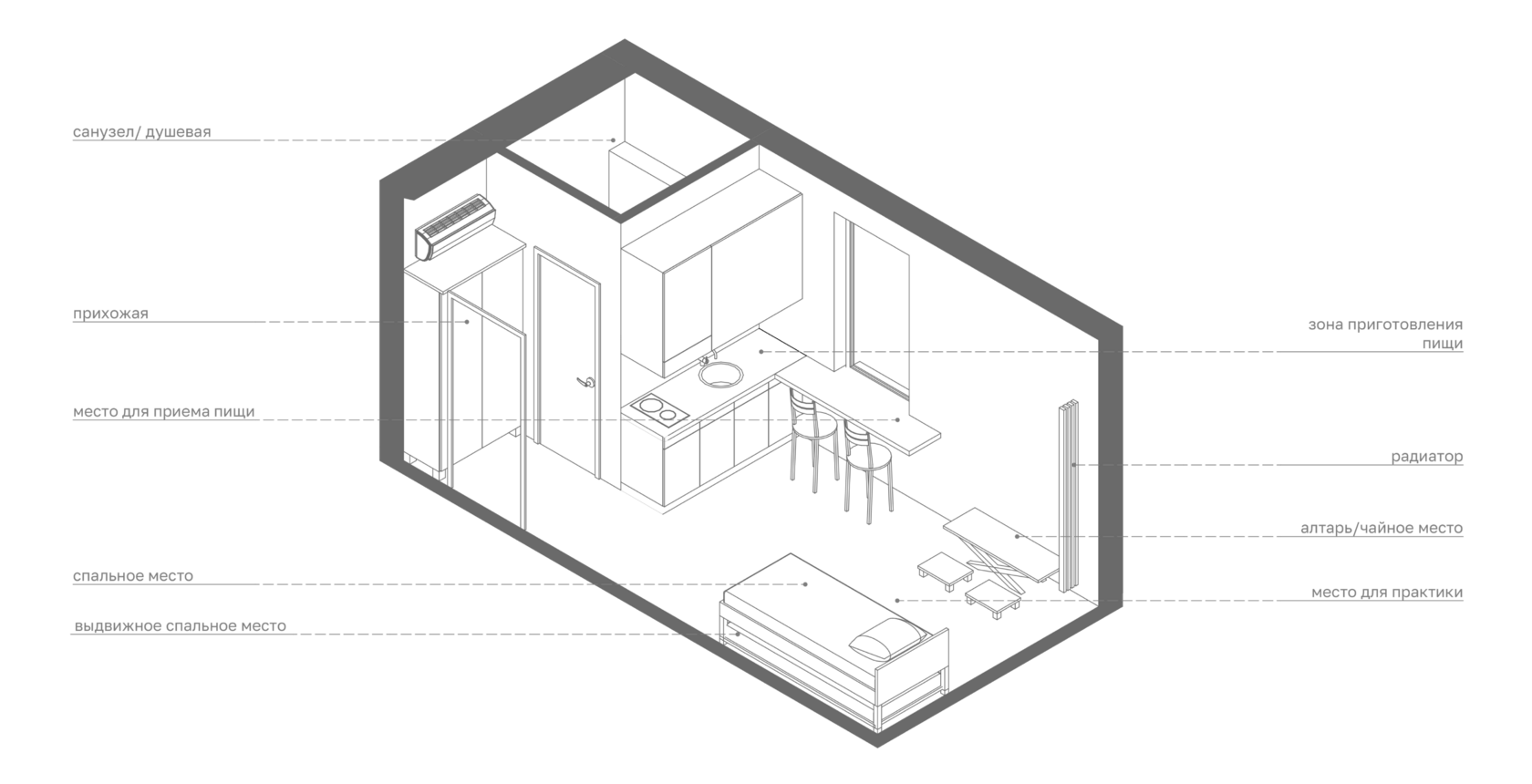 Внутри дома находится многофункциональное пространство для практики и сна.